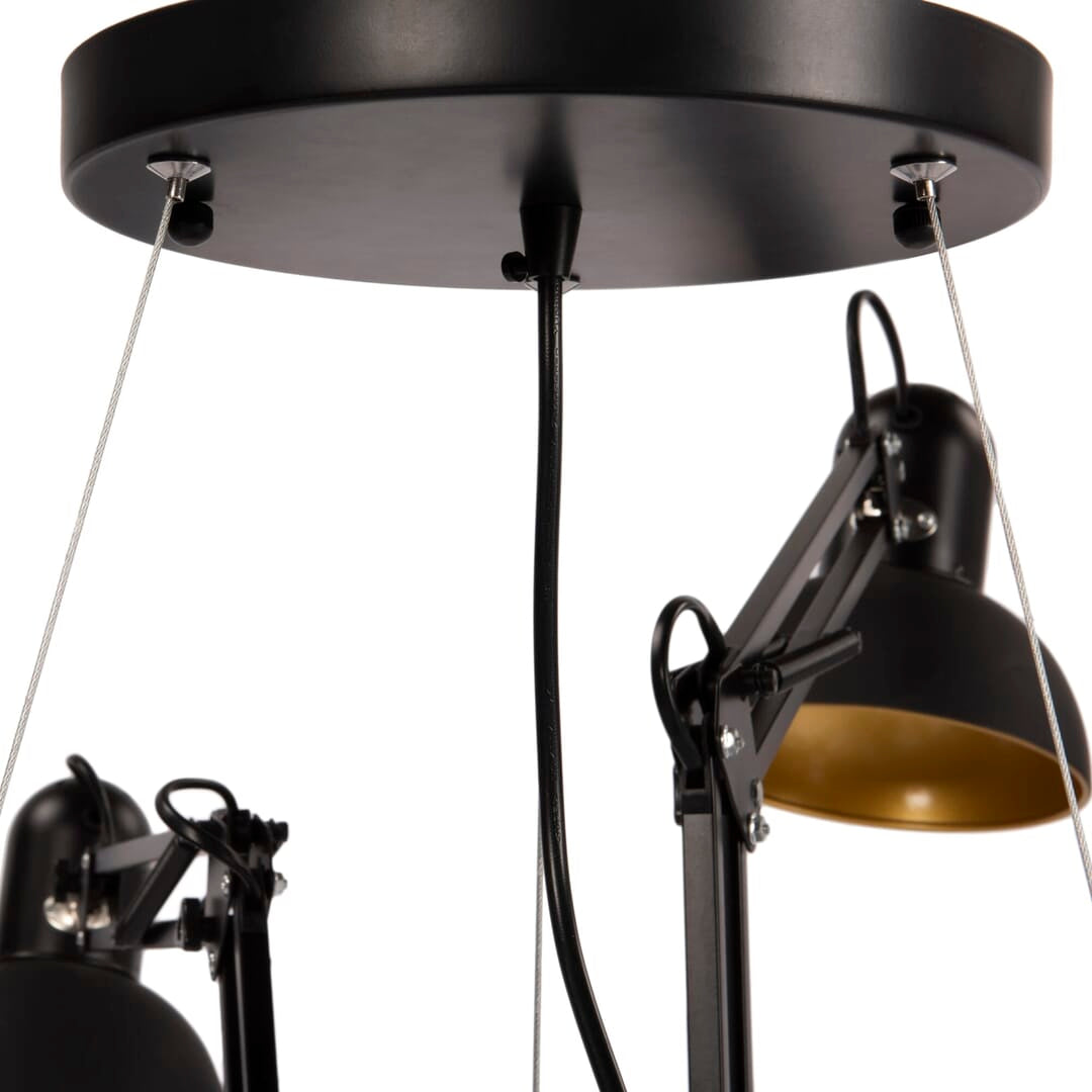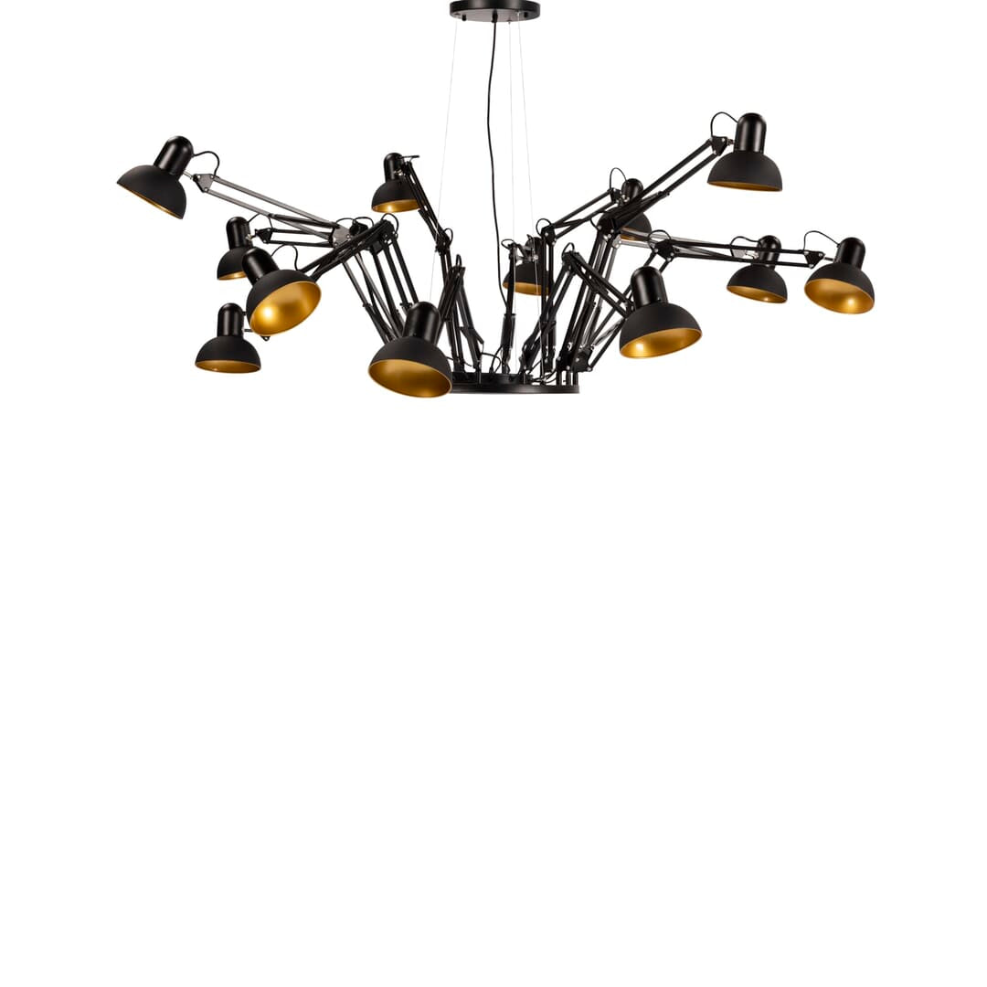 Candeeiro de teto em metal, 16 focos ajustáveis, cor preto. Compatível com casquilho E27 para lâmpadas 40W máximo (não incluídas). Compatibilidade energética com lâmpadas das classes E a A. Dimensões: Ø120; altura ajustável 0,8 a 1,5 m ; comprimento do cabo 1,2 m.