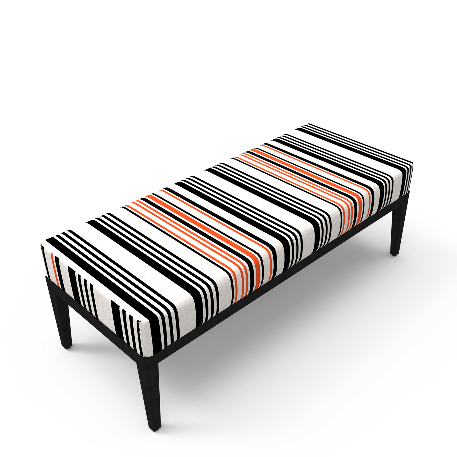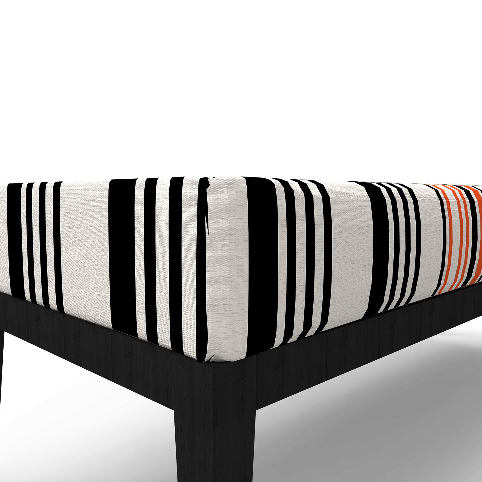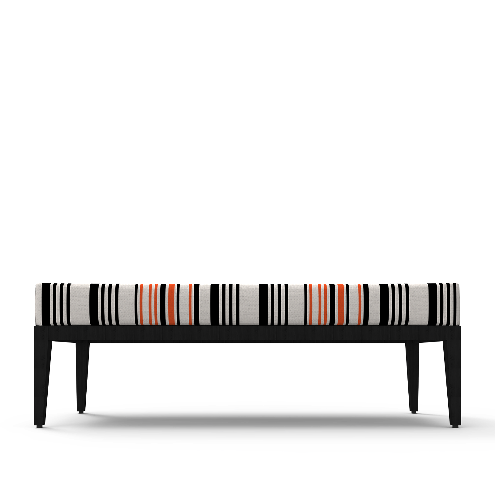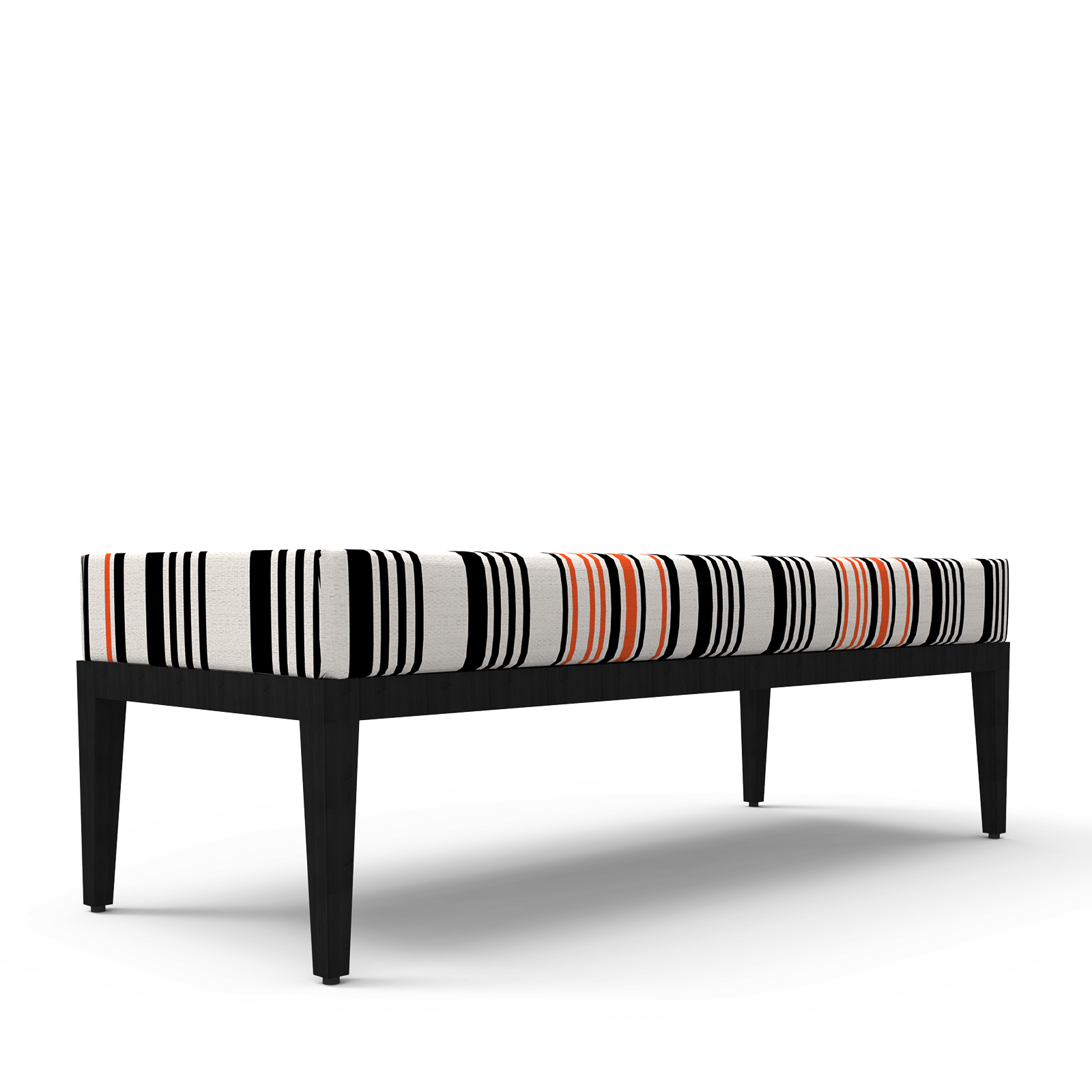 Banqueta Estutura em madeira maciça, acabamento em velatura preta. Assento em espuma de alta densidade, revestido em tecido as riscas L.150 x P.60 cm x A.50