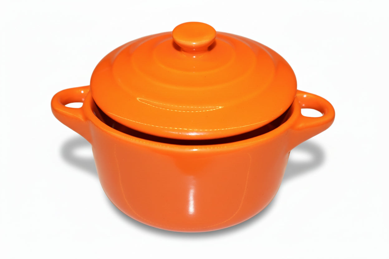 Pequena tigela refratária, de porcelana, com uma tampa combinando, usada para porções individuais de sobremesas como creme brûlée, suflês, pudins, ou para servir molhos e petiscos, sendo um item funcional e decorativo para a cozinha,