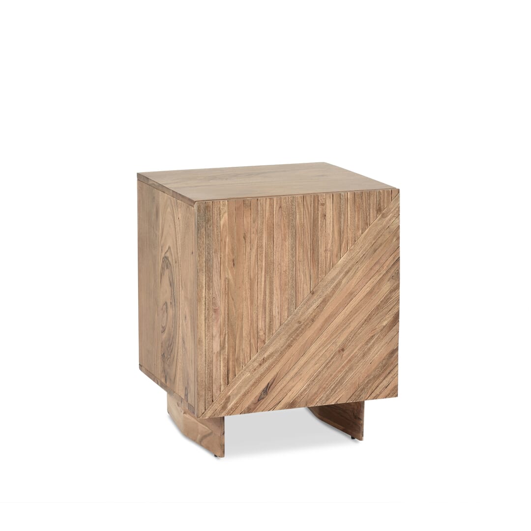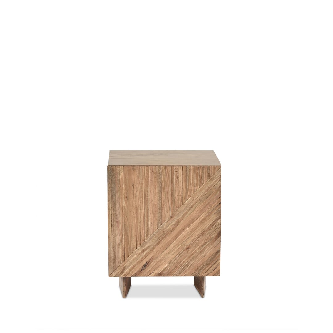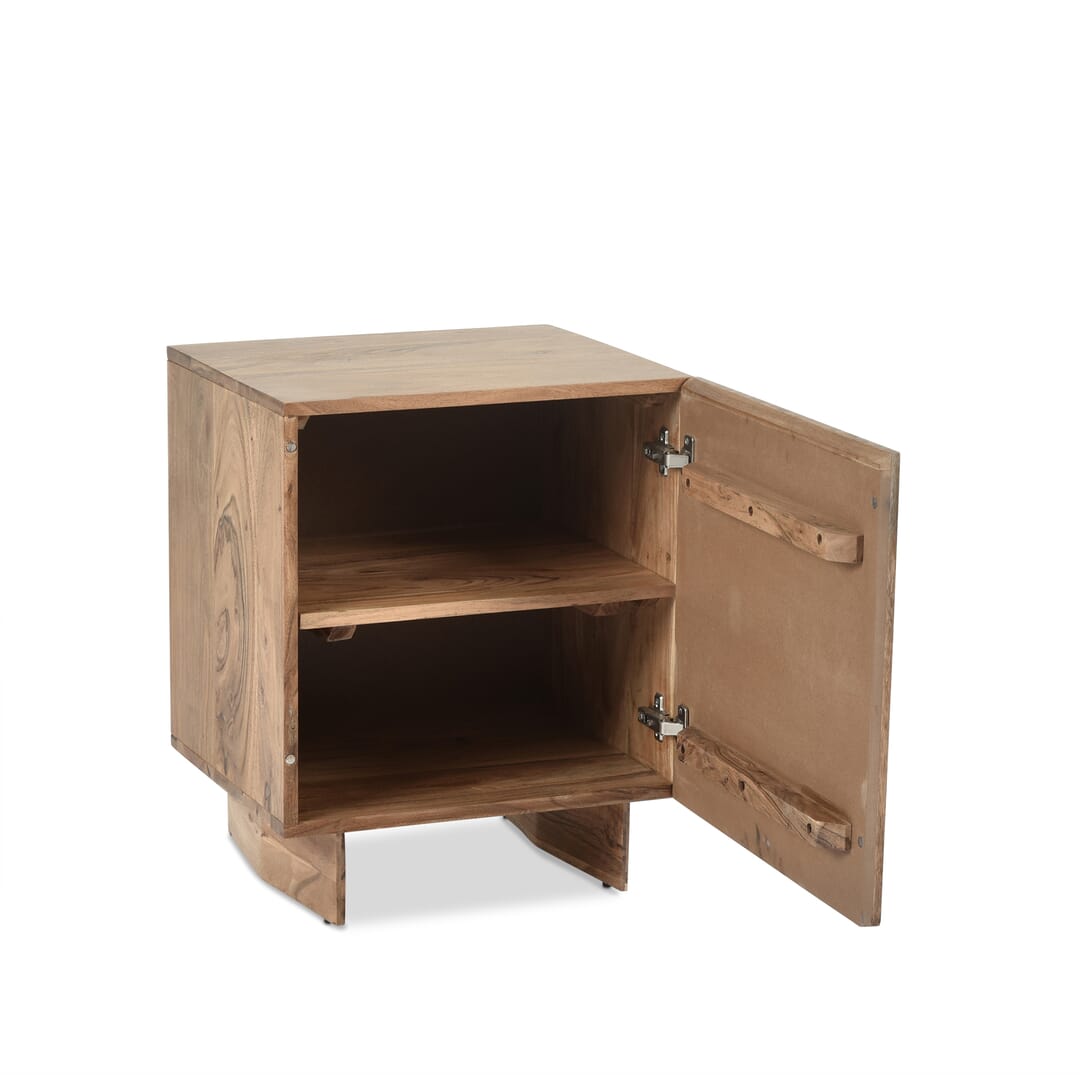 Mesa de cabeceira Estrutura em madeira de Acácia maciça, com uma porta e prateleiras ajustáveis. Pés em madeira Acácia maciça. L. 45 x A. 55 x P. 45 cm