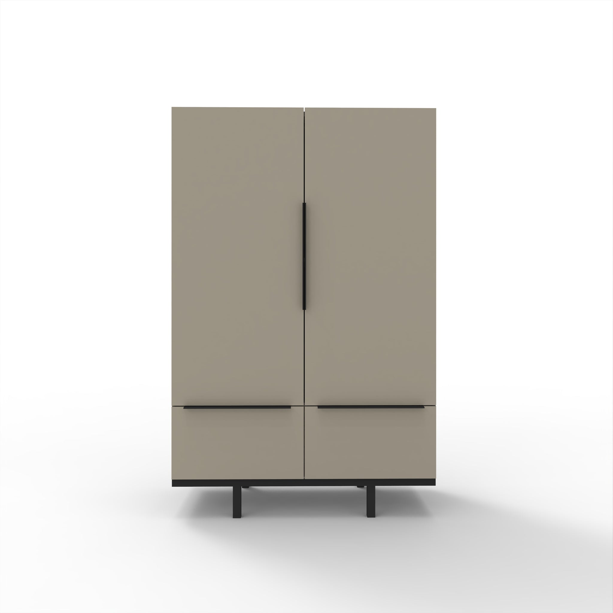 Estrutura em MDF bege, estrutura para suporte em ferro lacado em preto, com duas gavetas e duas portas