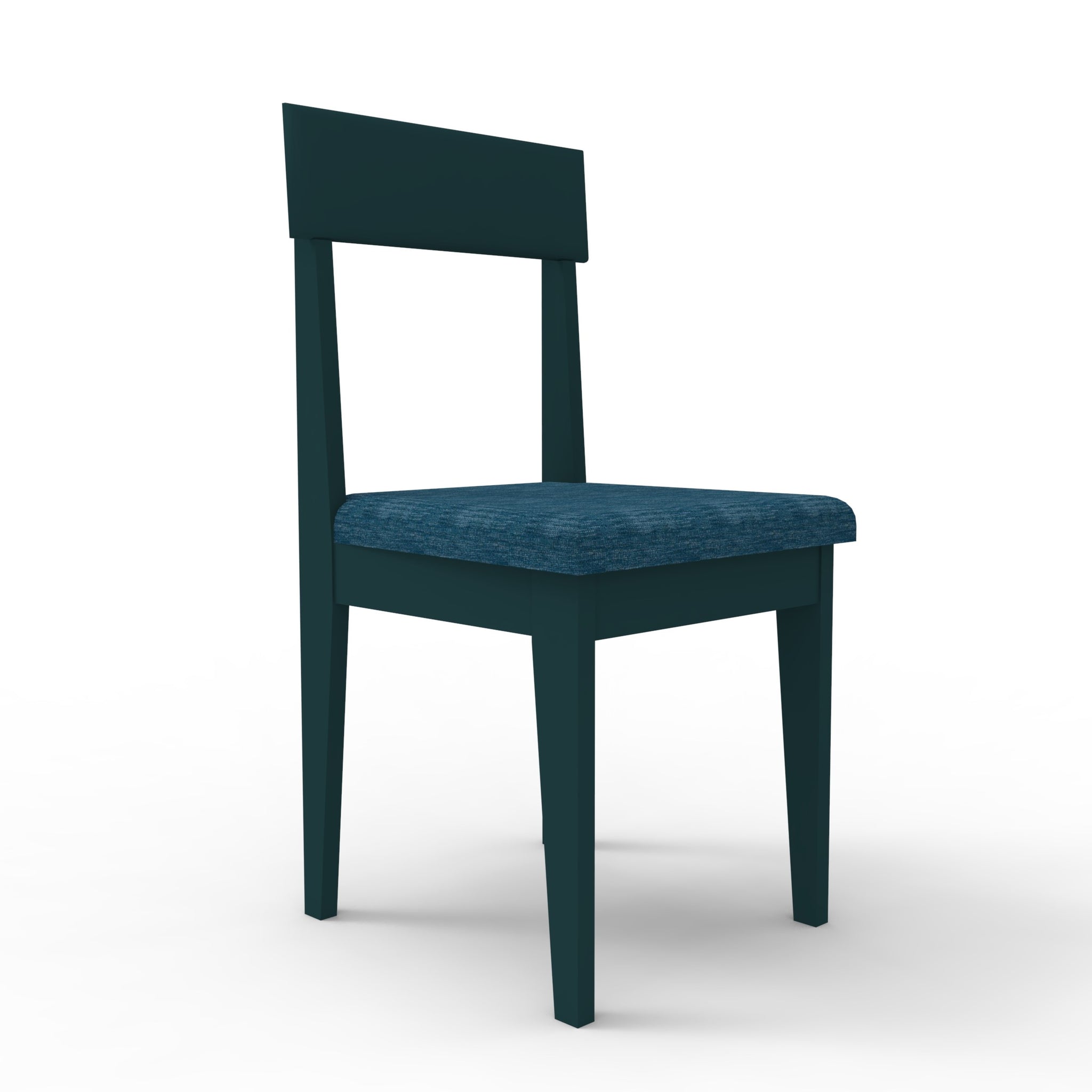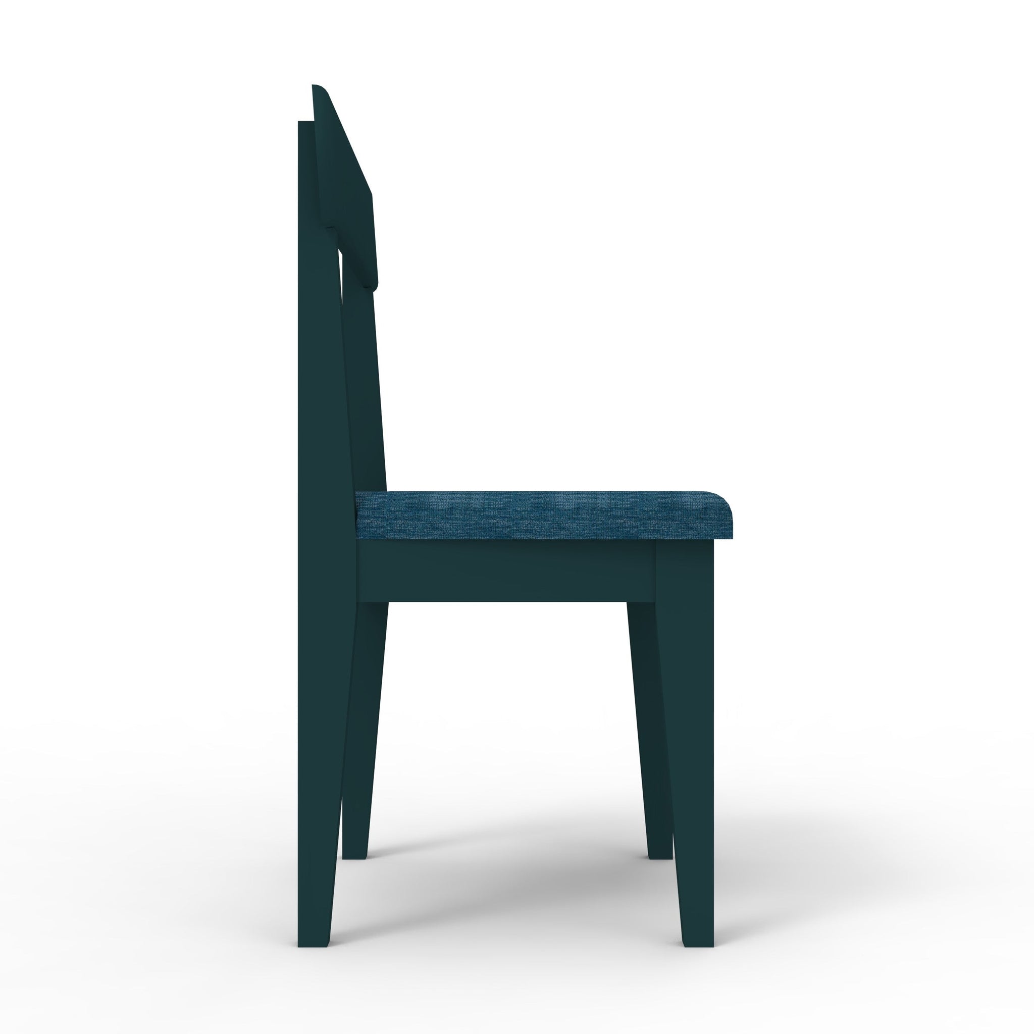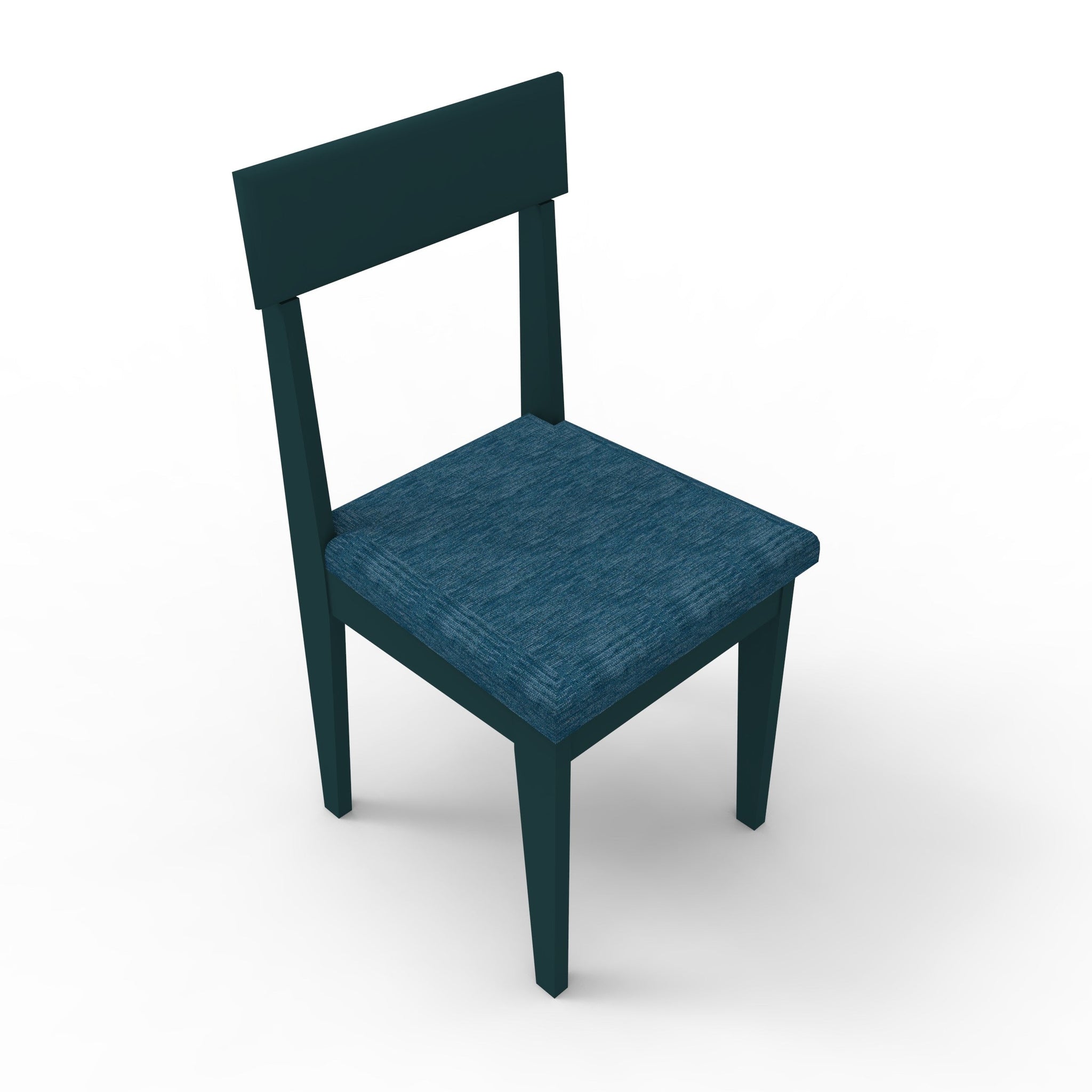 Cadeira com estrutura feita com madeira maciça lacada a cor verde, assento estofado revestido em tecido aveludado azul esverdeado.