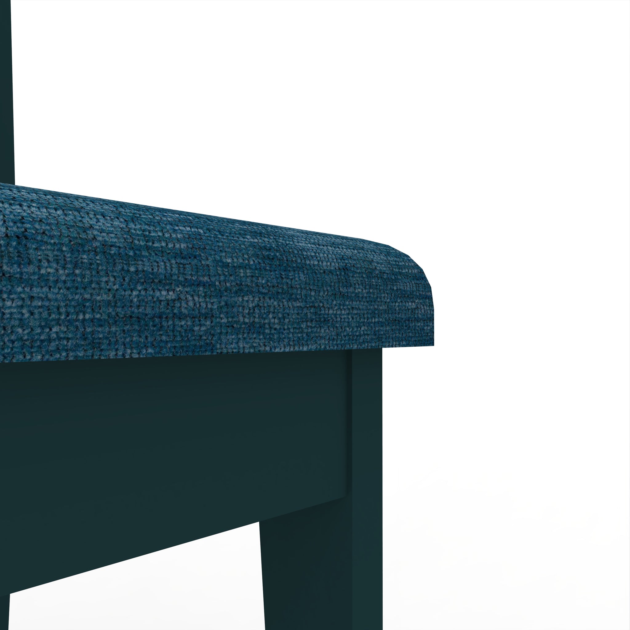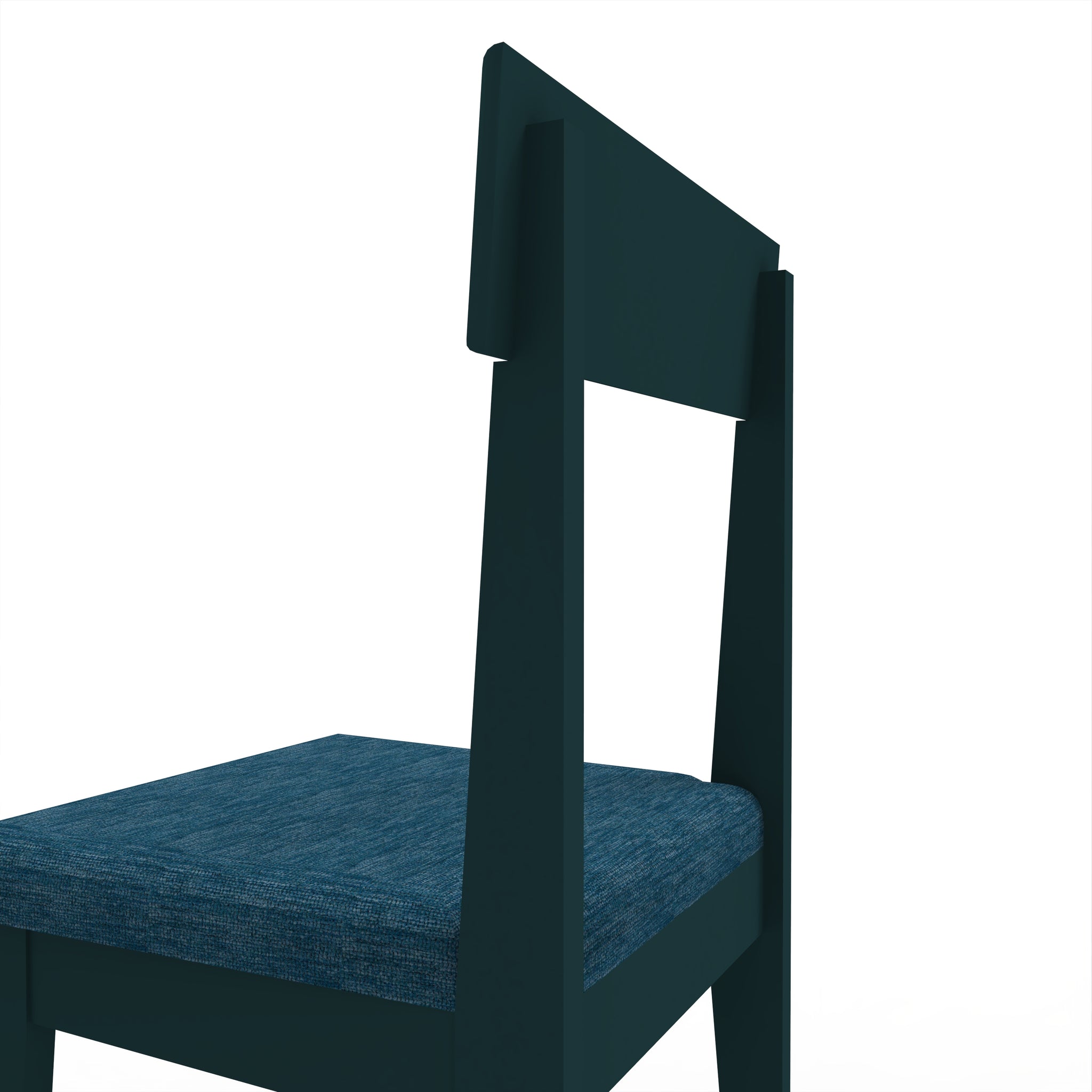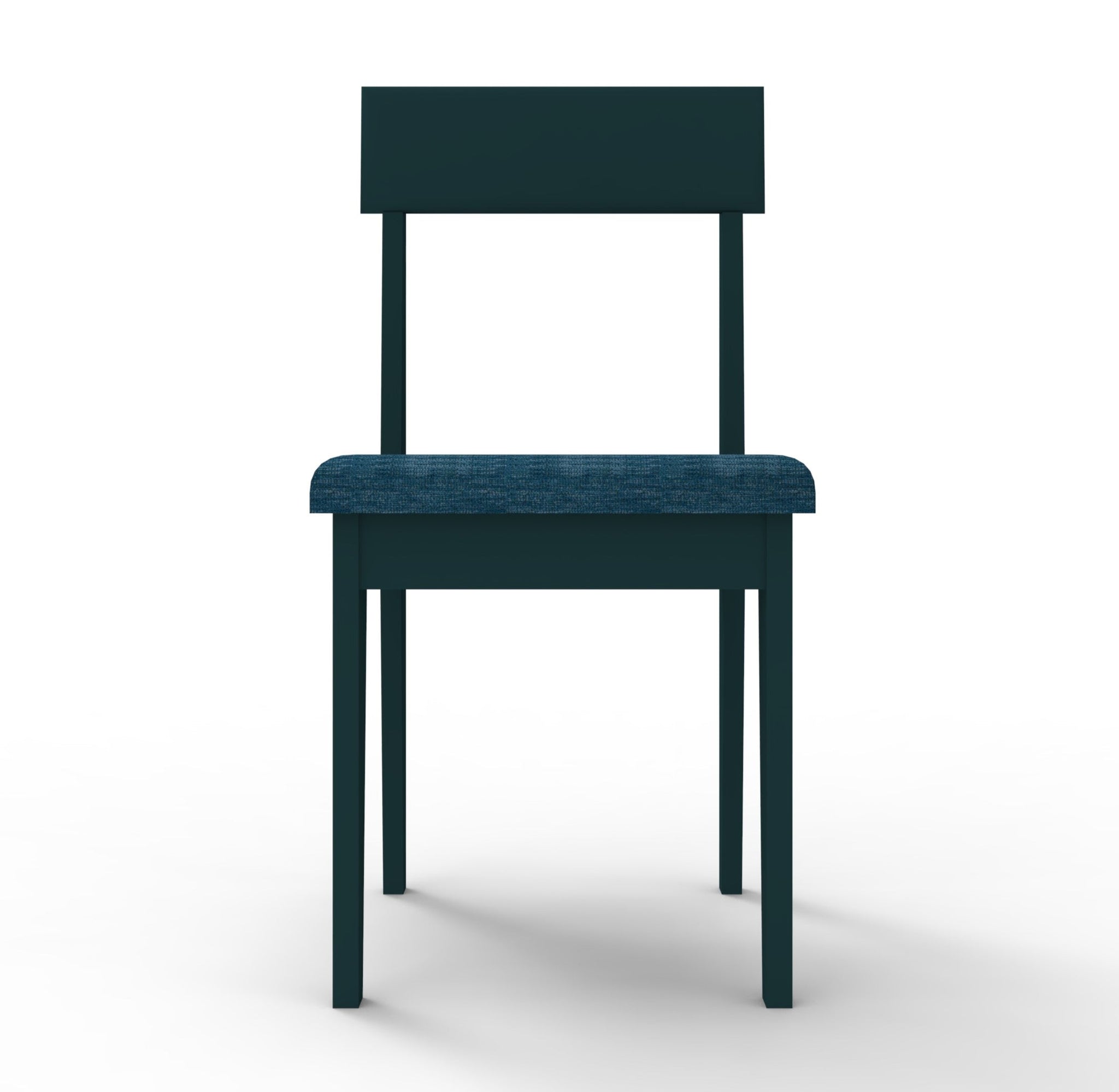 Cadeira com estrutura feita com madeira maciça lacada a cor verde, assento estofado revestido em tecido aveludado azul esverdeado.