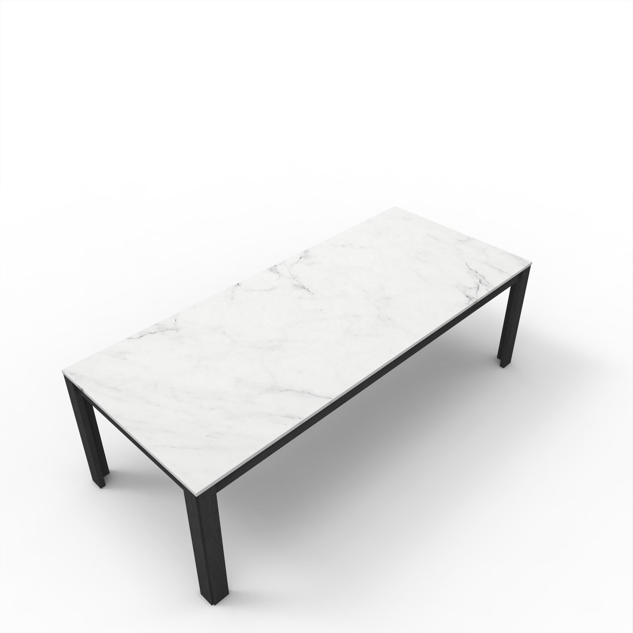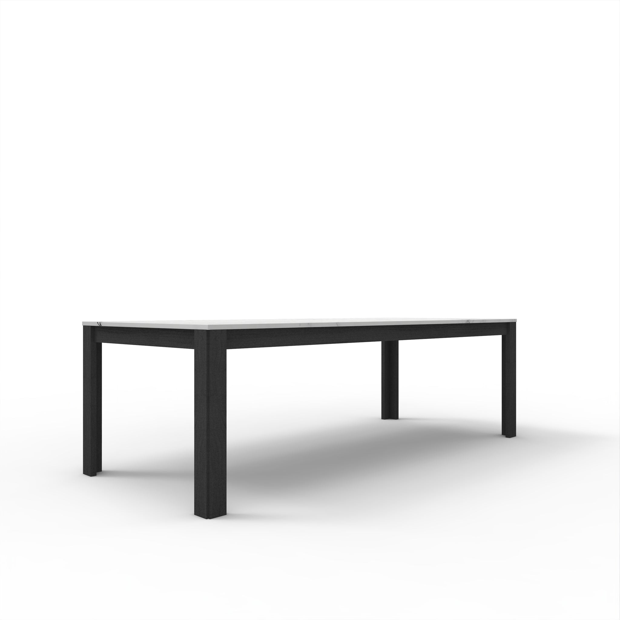Mesa de Jantar Estrutura em madeira imensa, acabamento em velatura preta. Tampo em pedra Mármore branco Namibe C.244 x P.104 x A.75