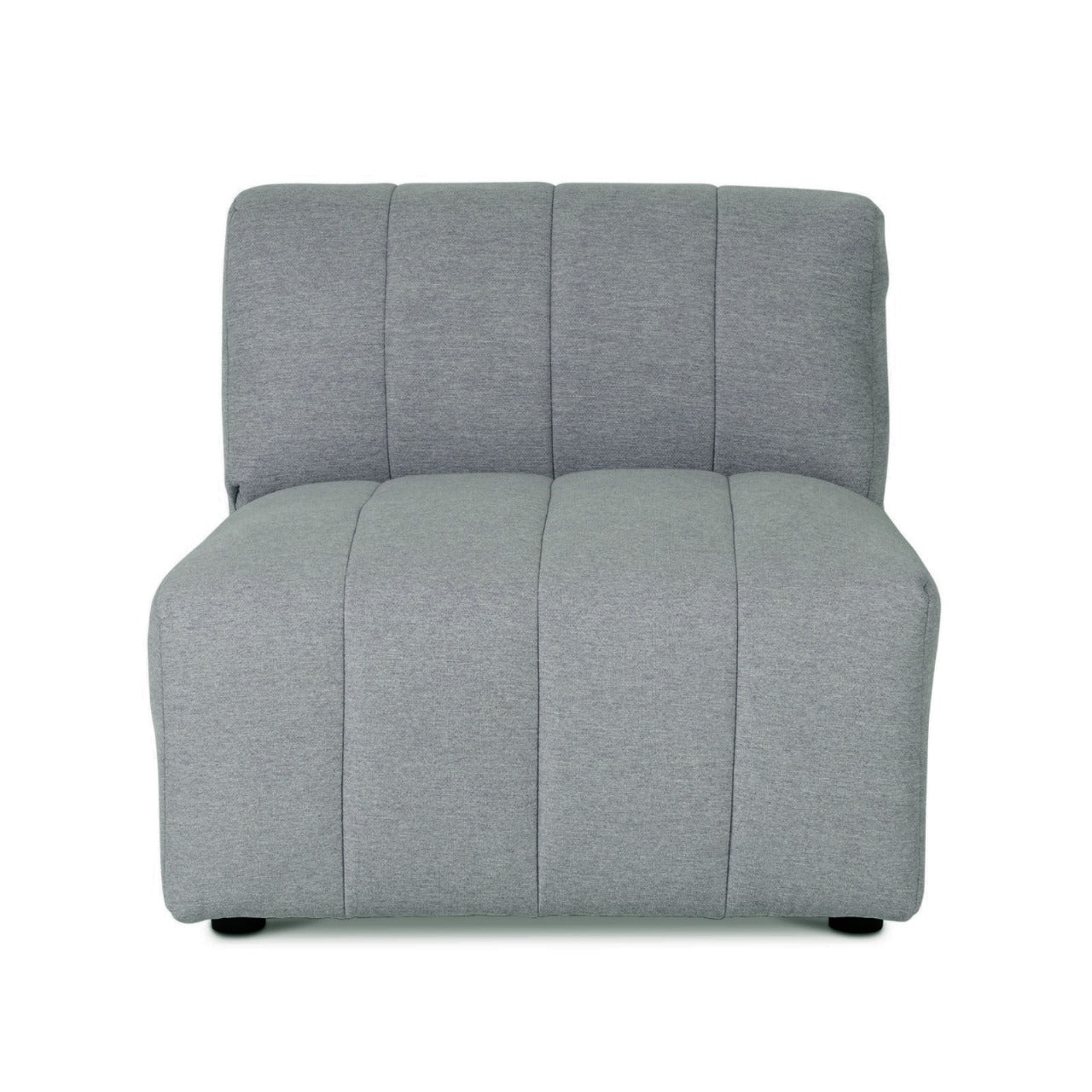 Estrutura em contraplacado e pinho. Almofadas com enchimento em espuma de densidade 23 a 26kg/m3. Capas em tecido aveludado cinza claro. Pés em plástico.